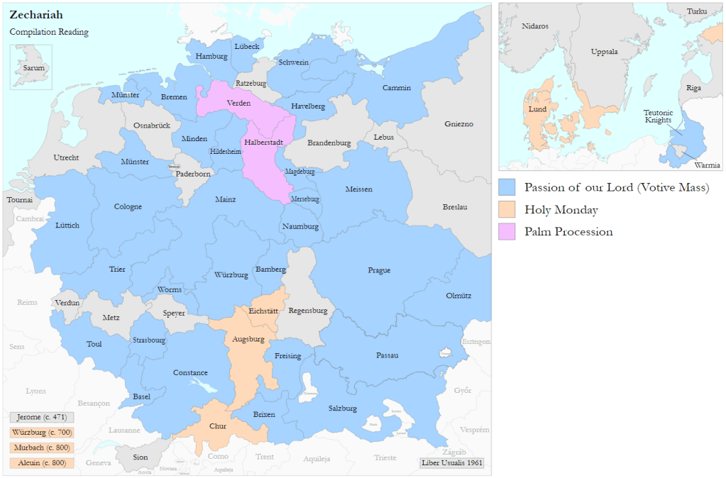 This compilation first appeared some thirteen centuries ago (Würzburg Comes, c. 700), though not yet in finished form. Six versions of the reading can be found in our sources, spanning a period of more than 850 years. The most ancient tradition assigns this reading to Holy Monday as a rare, third reading. By the beginning of the sixteenth century, the custom of a third reading on Holy Monday had disappeared in all but a few dioceses. Most retained the Zechariah compilation in a votive mass for the Passion. In two dioceses, however, Zechariah was read in place of Exodus 16 for the Palm Sunday Procession: Halberstadt and Verden (which used the Halberstadt missal). The final form of the compilation, printed in the Halberstadt 1511 missal and reproduced above, is easily the best.